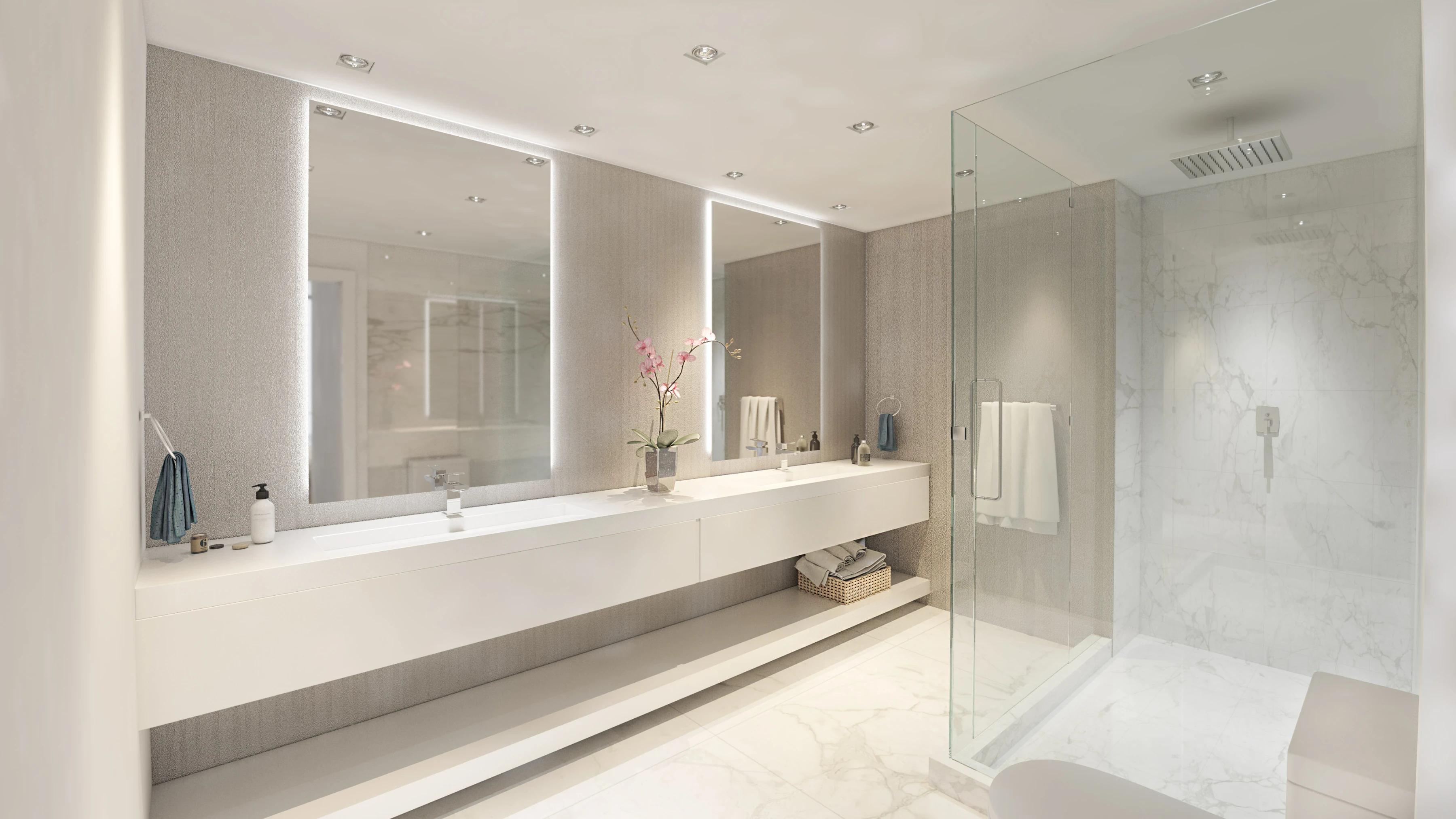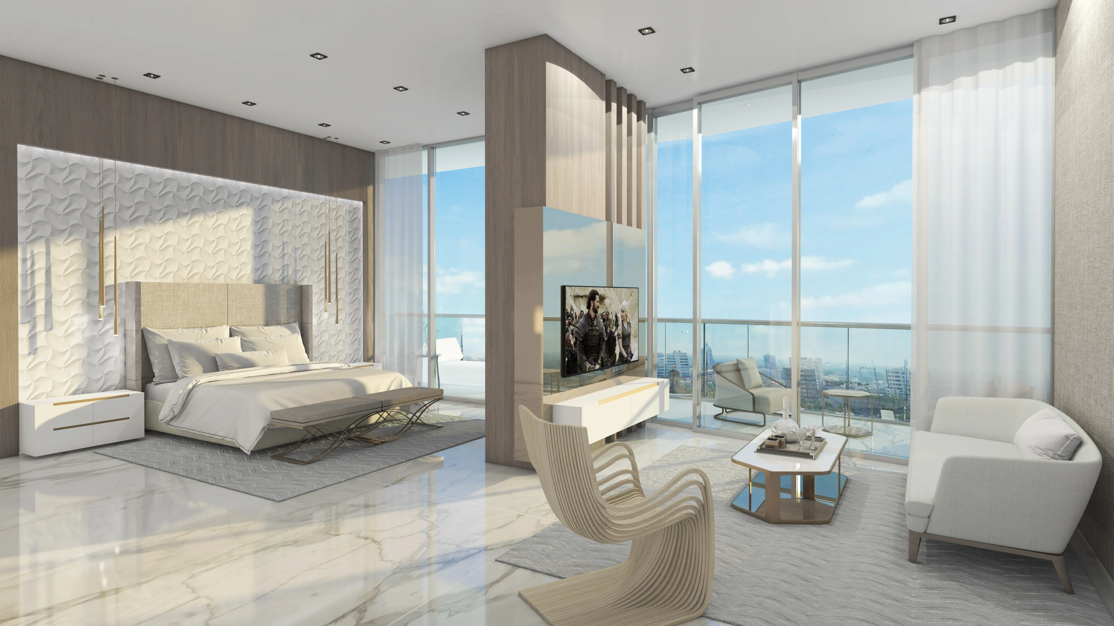 - Contemporary architecture with glass-lined balconies and spacious floor plans