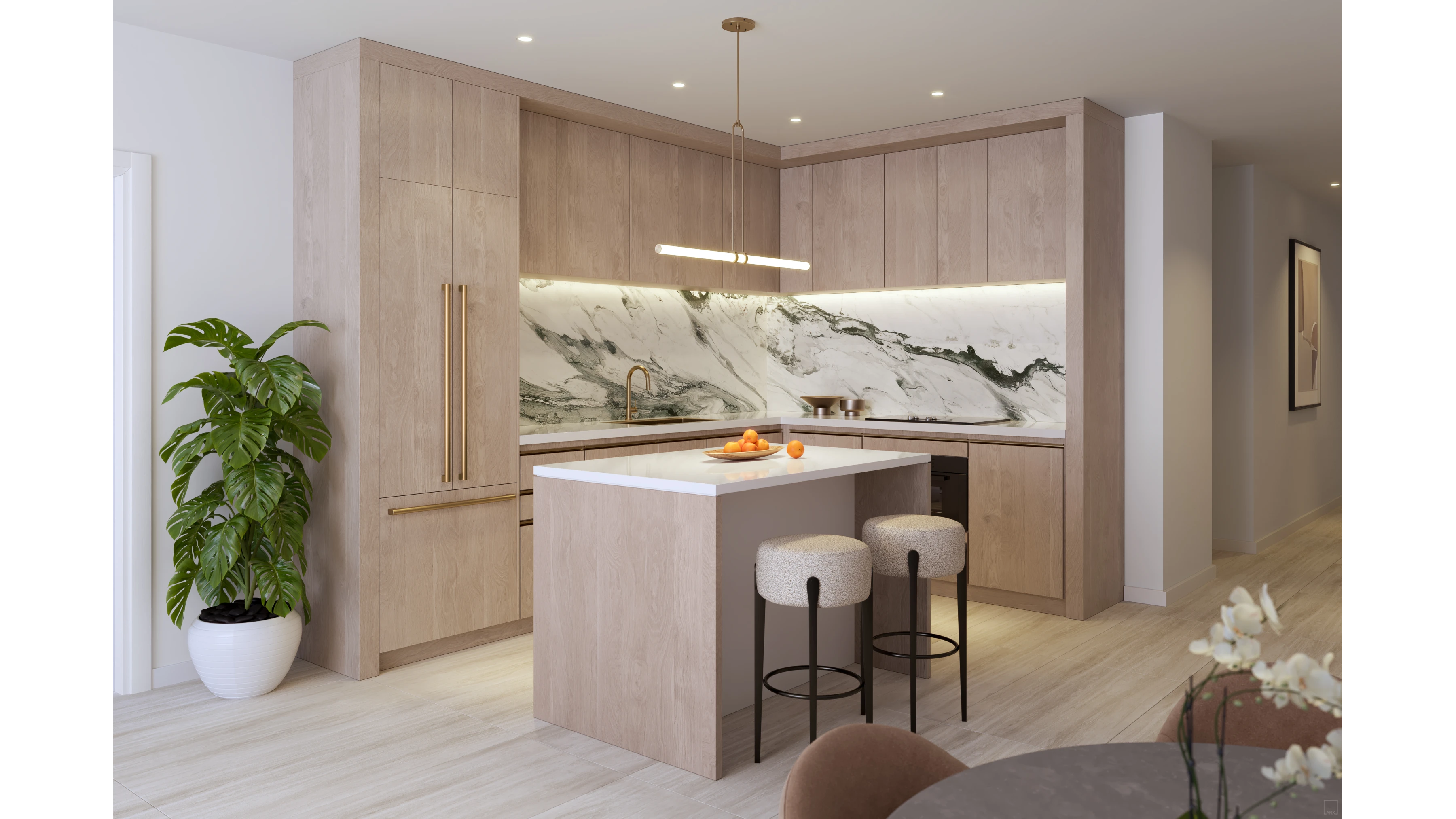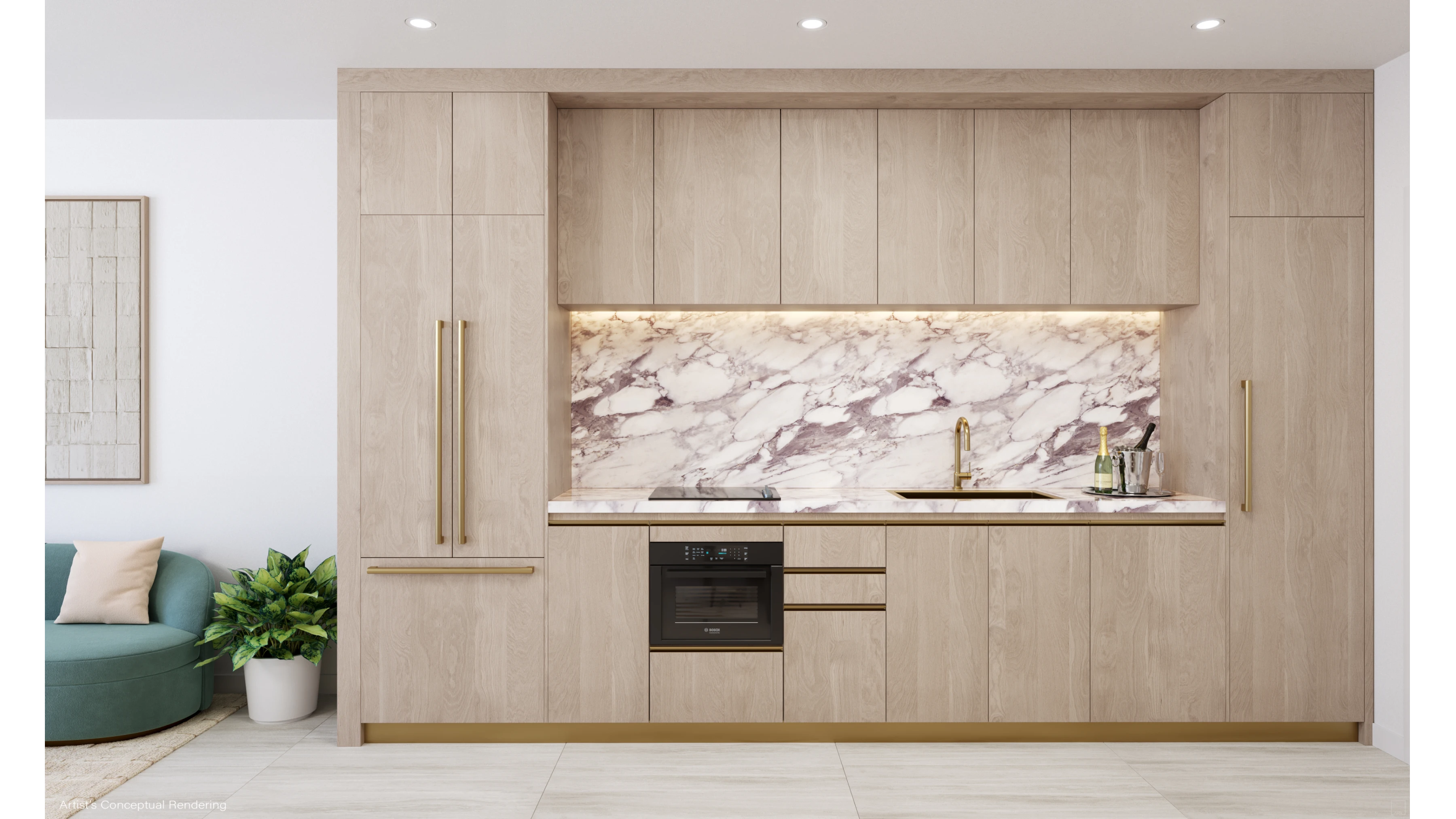 - Italian cabinetry, quartz countertops, and designer brass finishes