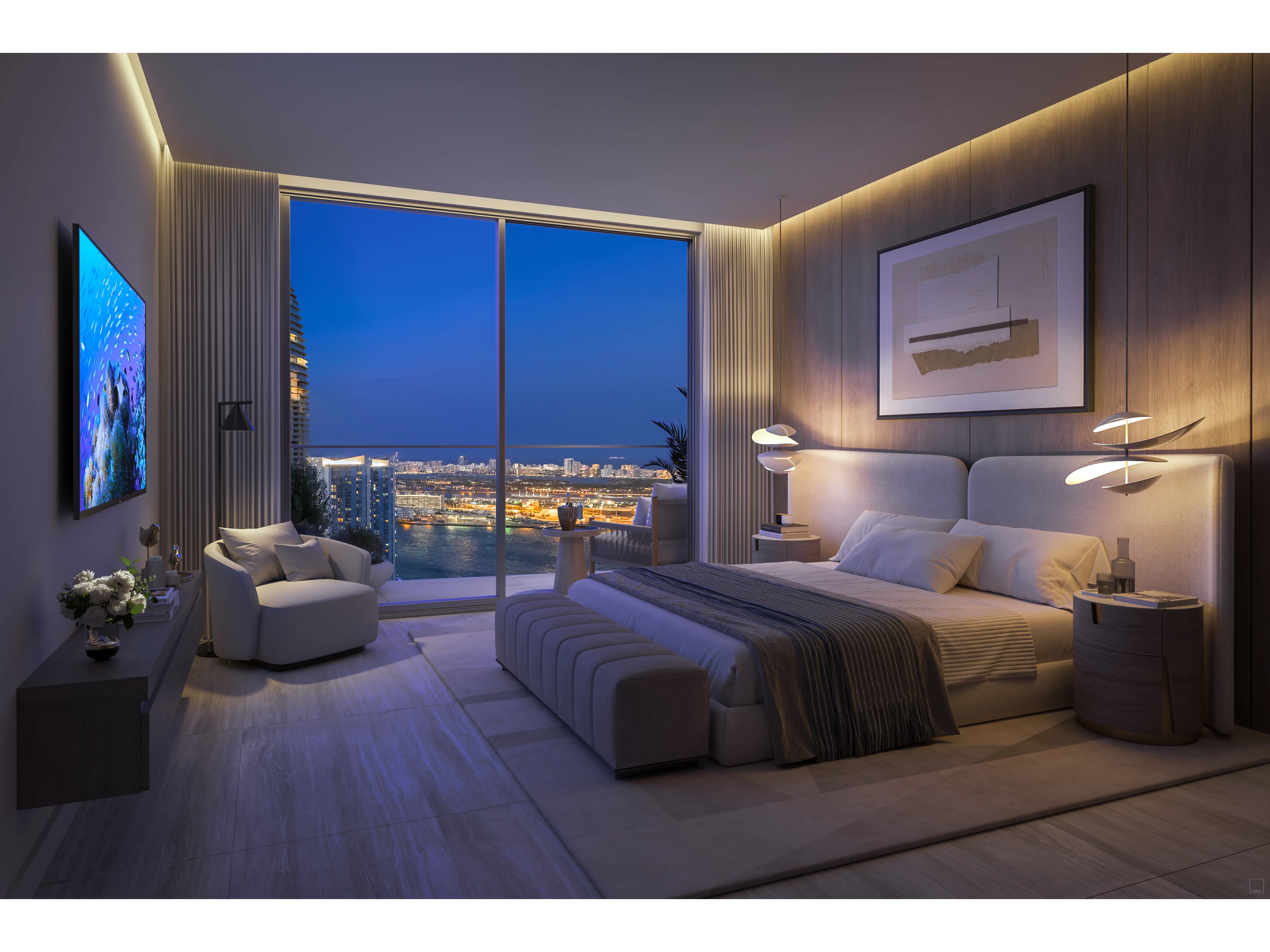 - Floor-to-ceiling impact glass windows with views of bay, river, and skyline